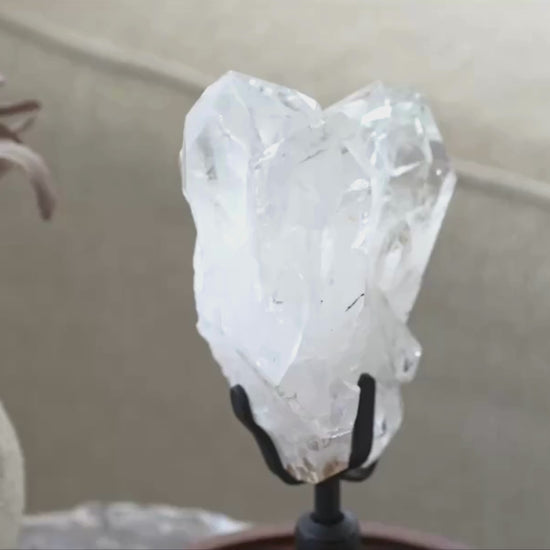 Evoking nature’s unmatched artistry, this one-of-kind Quartz Crystal displays its raw beauty on a black iron stand. The mesmerizing white sheen, smooth surfaces and rough edges come together as an inimitable piece of art.