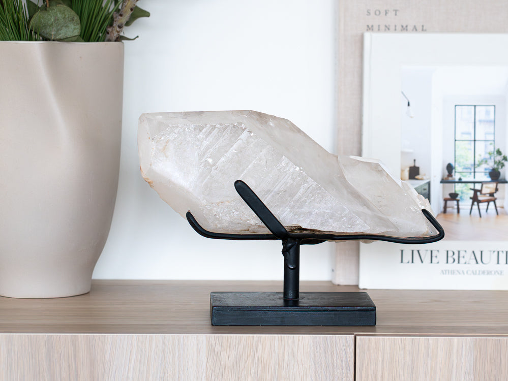 Evoking nature’s unmatched artistry, this one-of-kind Quartz Crystal displays its raw beauty on a black iron stand. The mesmerizing white sheen, smooth surfaces and rough edges come together as an inimitable piece of art.