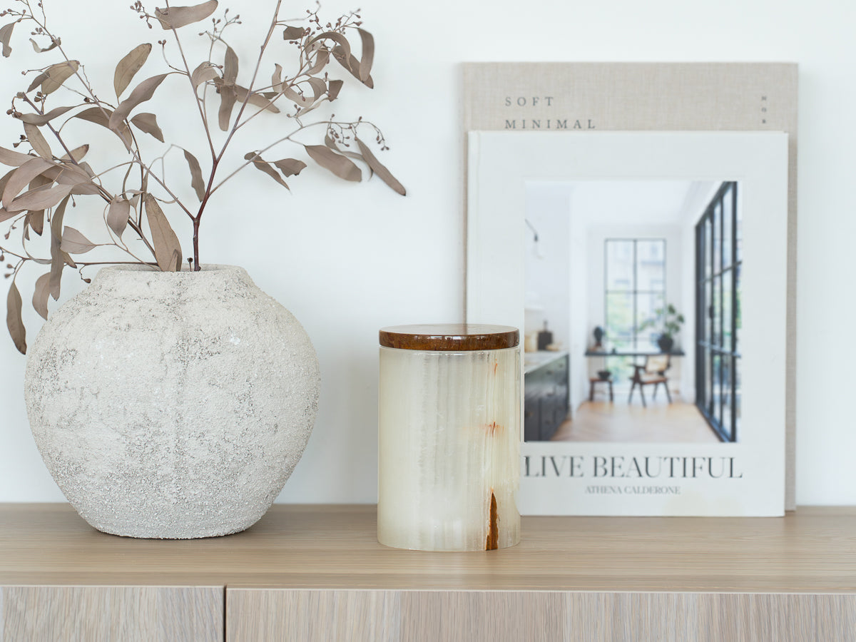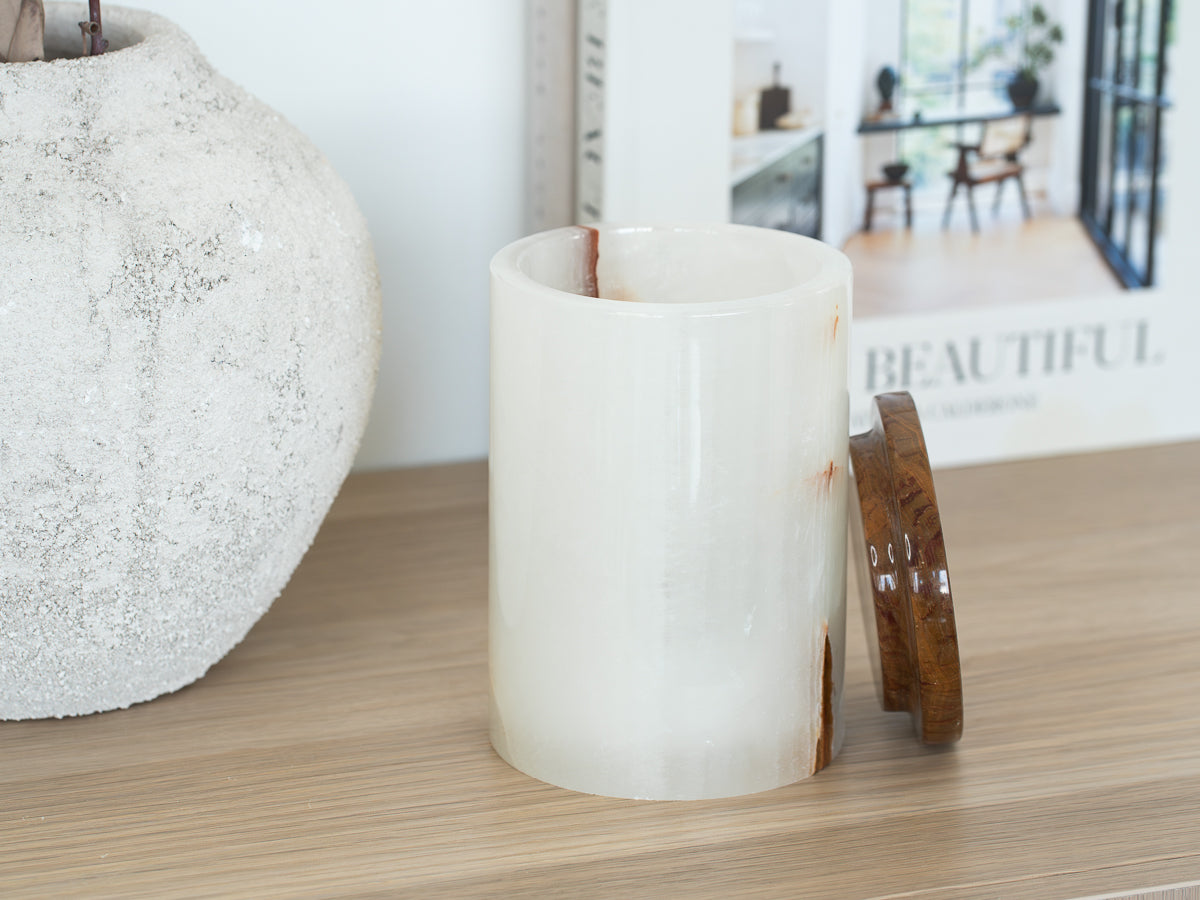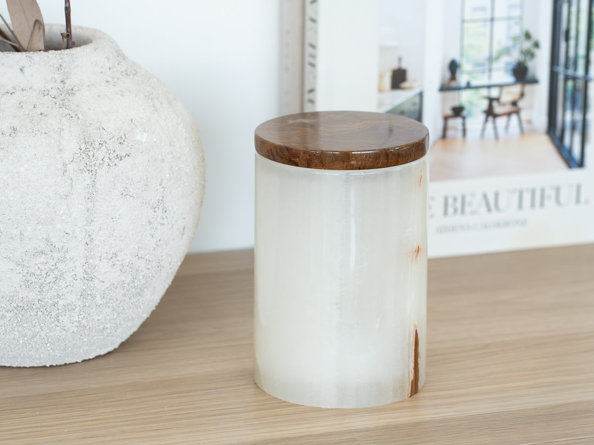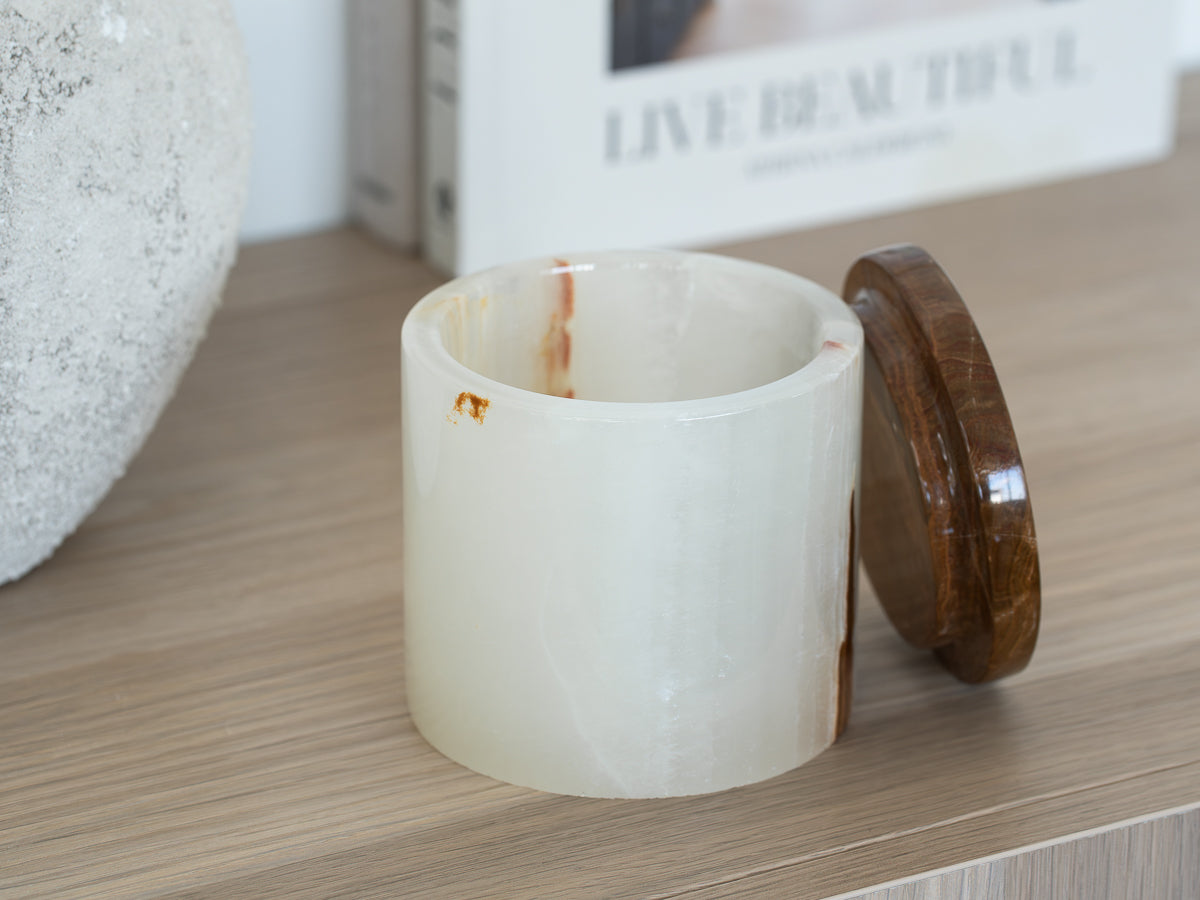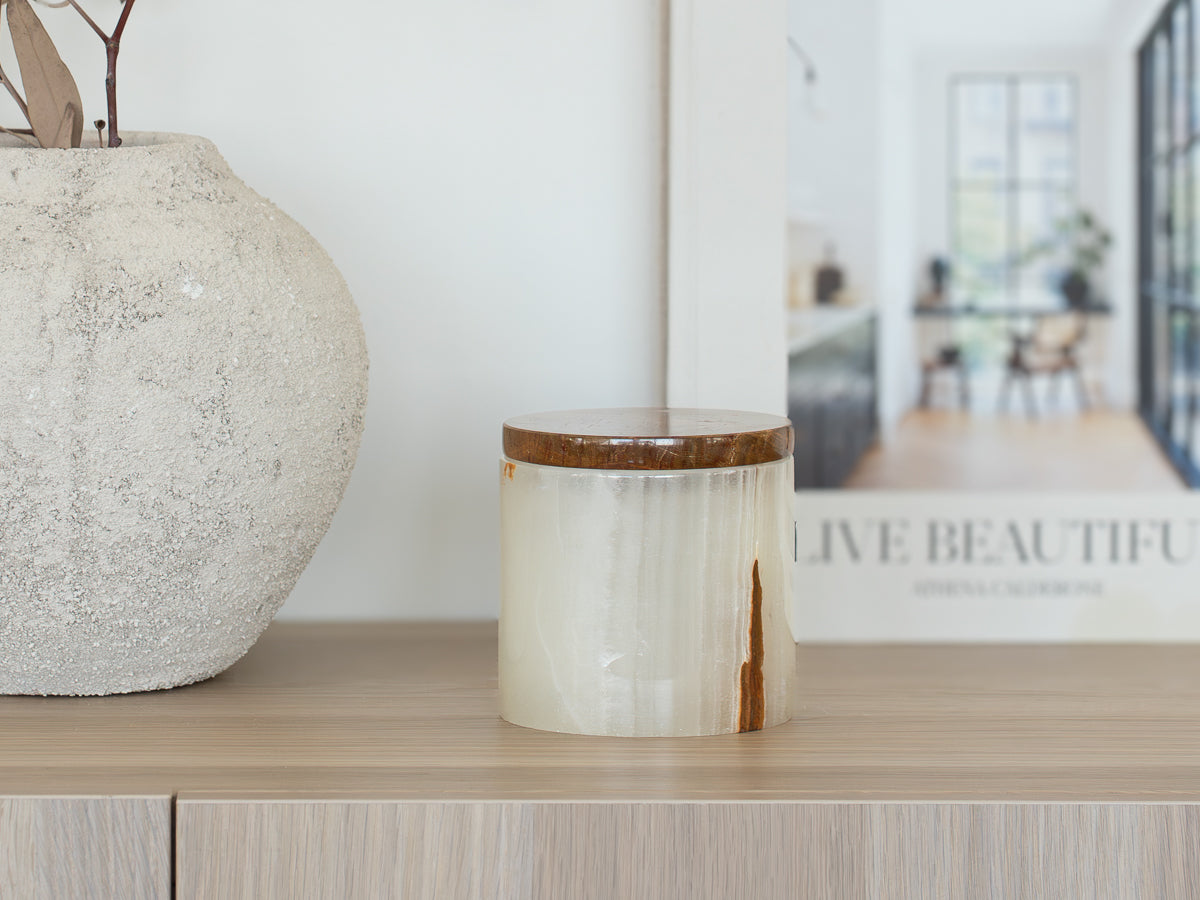Carved from natural Onyx, this elegant jar reveals soft golden and ivory tones that reflect nature’s quiet artistry. Both functional and refined, it offers a serene way to store small treasures or conceal everyday essentials with understated beauty.